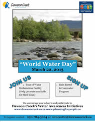 WORLD WATER DAY - March 22 - Water Reclamation Tour Tour of our Water Reclamation Facility was a great success enjoyment held by all. The group had the opportunity to ride the bus to see first-hand how Shell uses the piped reclaimed water. All participants were treated to a great lunch provided by Shell. WORLD WATER DAY - March 22 - International Year of Water Cooperation Each year World Water Day highlights a specific aspect of freshwater with this year's theme "International Year of Water Cooperation". The City of Dawson Creek is inviting the community to participate in the following upcoming events:
